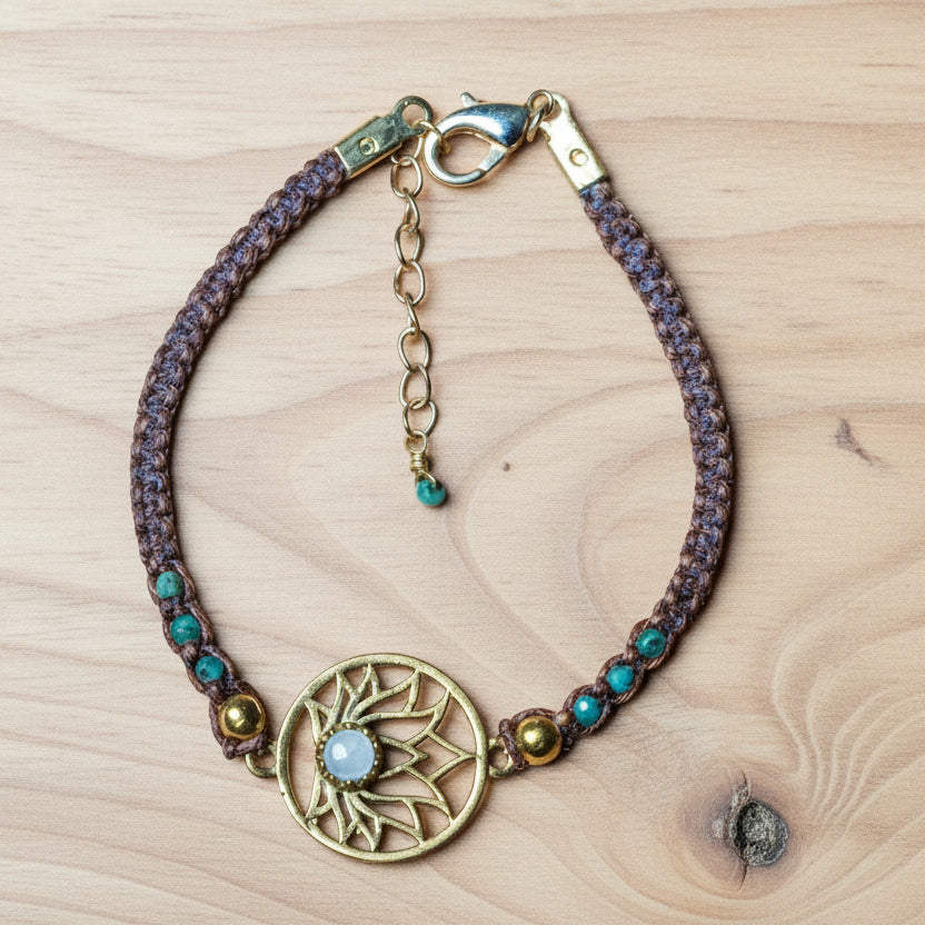 This beautiful upcycled meditation bracelet is adorned with a brass feature charm with a moonstone placed in a lotus design, sourced from Jaipur, India.