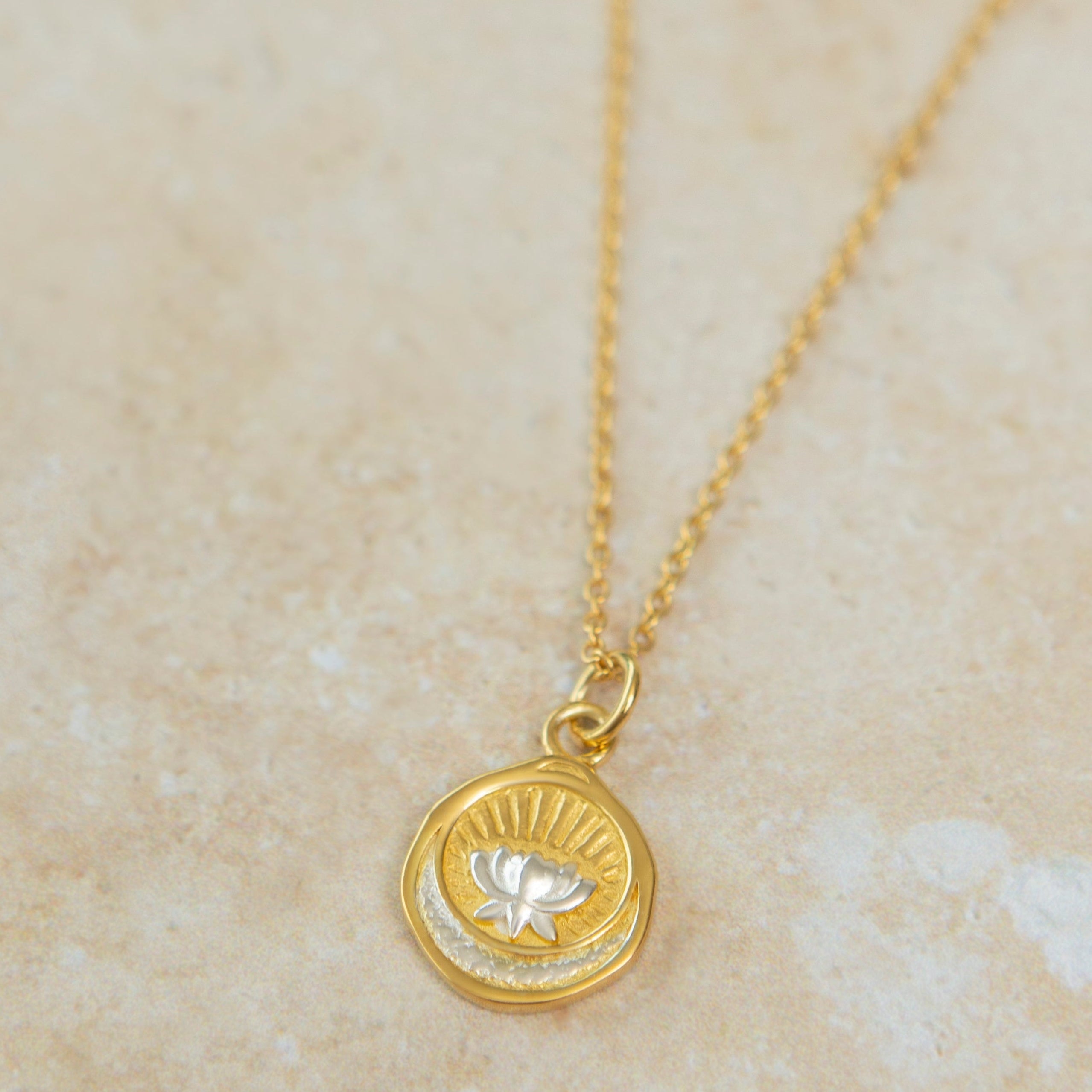 A sculpted lotus blooms at the heart of a golden medallion, framed by luminous sun rays and underpinned by a crescent moon — symbolising renewal, purity, and balance. Crafted in gold & silver tones, this piece evokes effortless elegance and is a beautiful symbol of inner radiance.