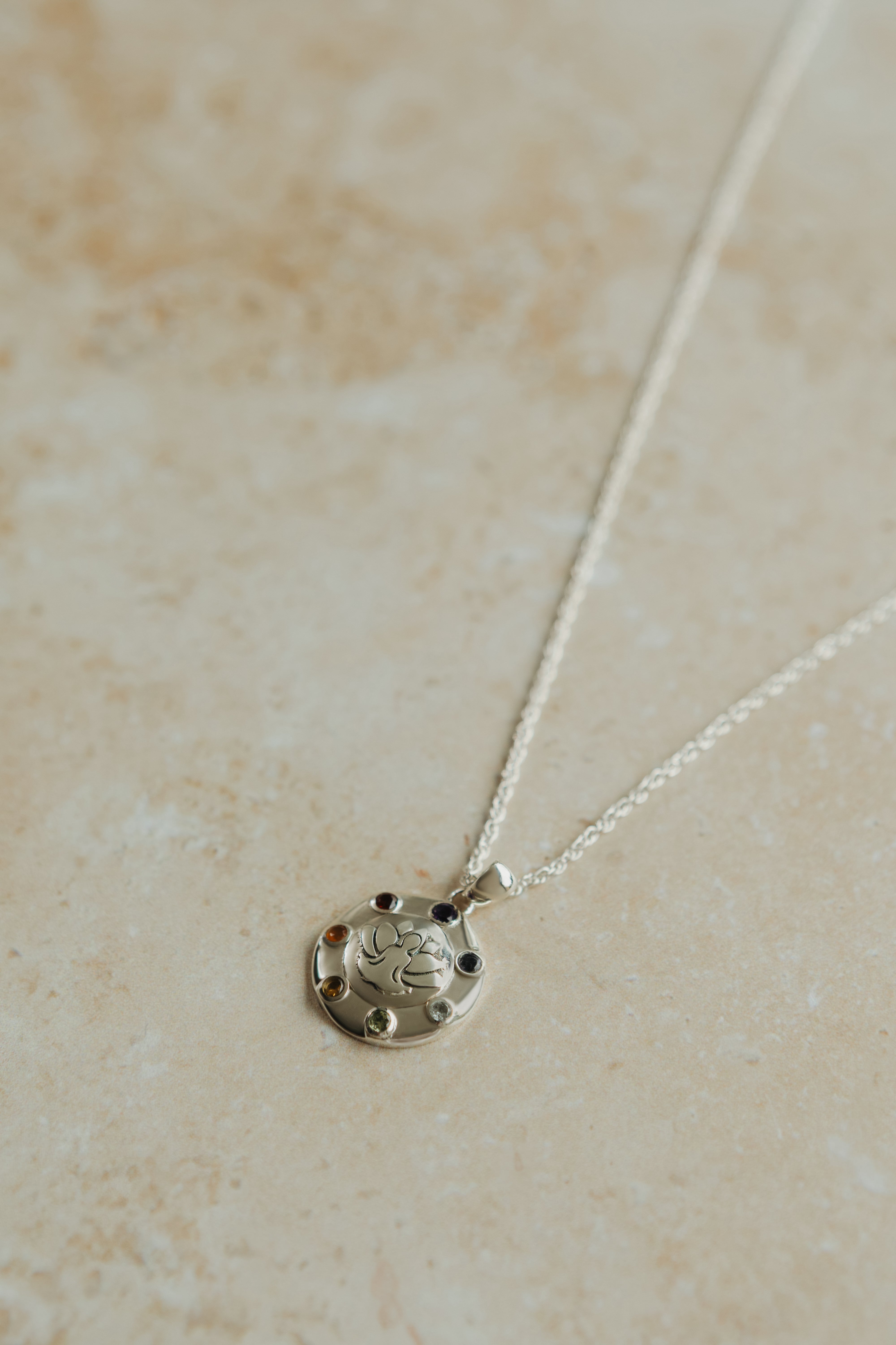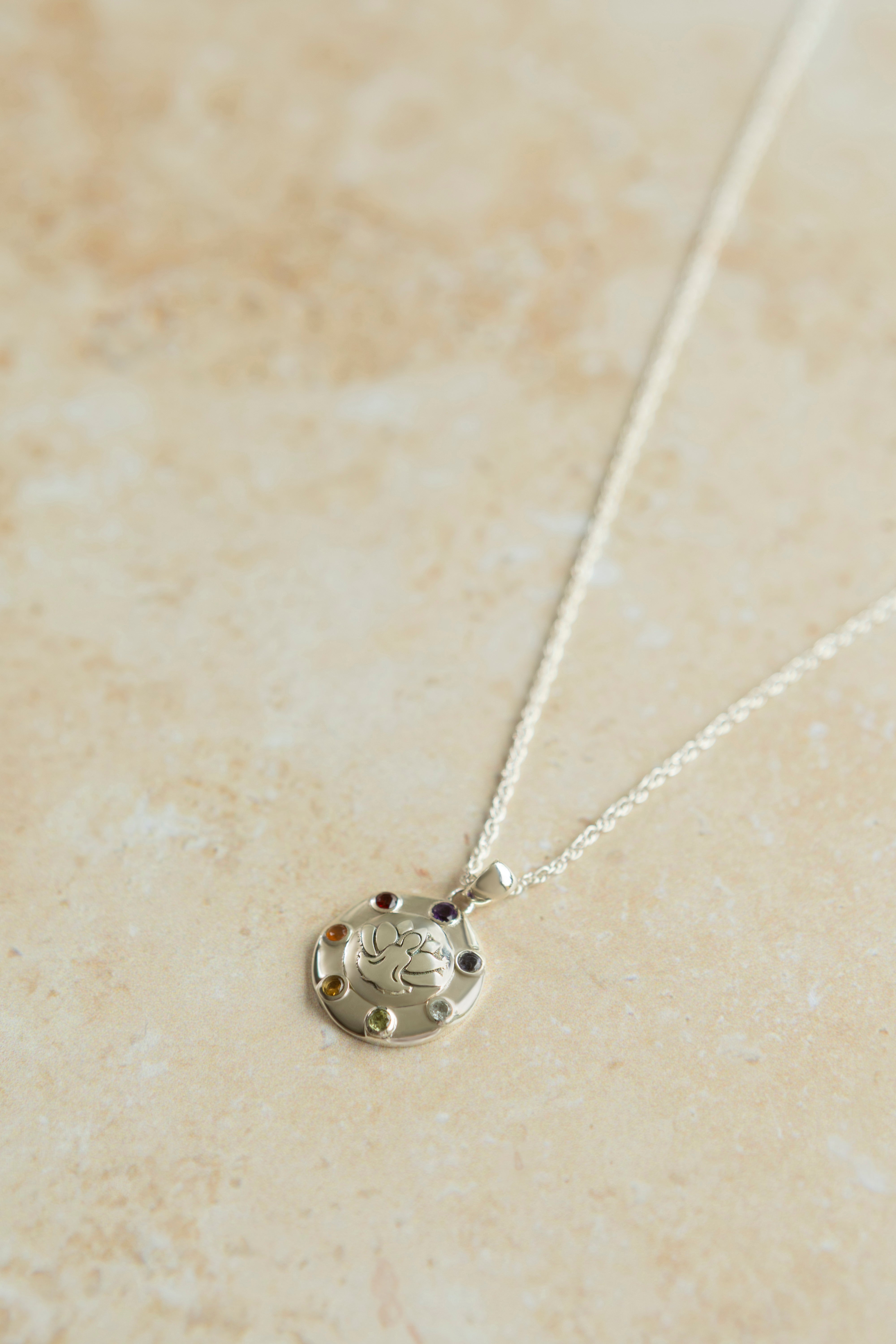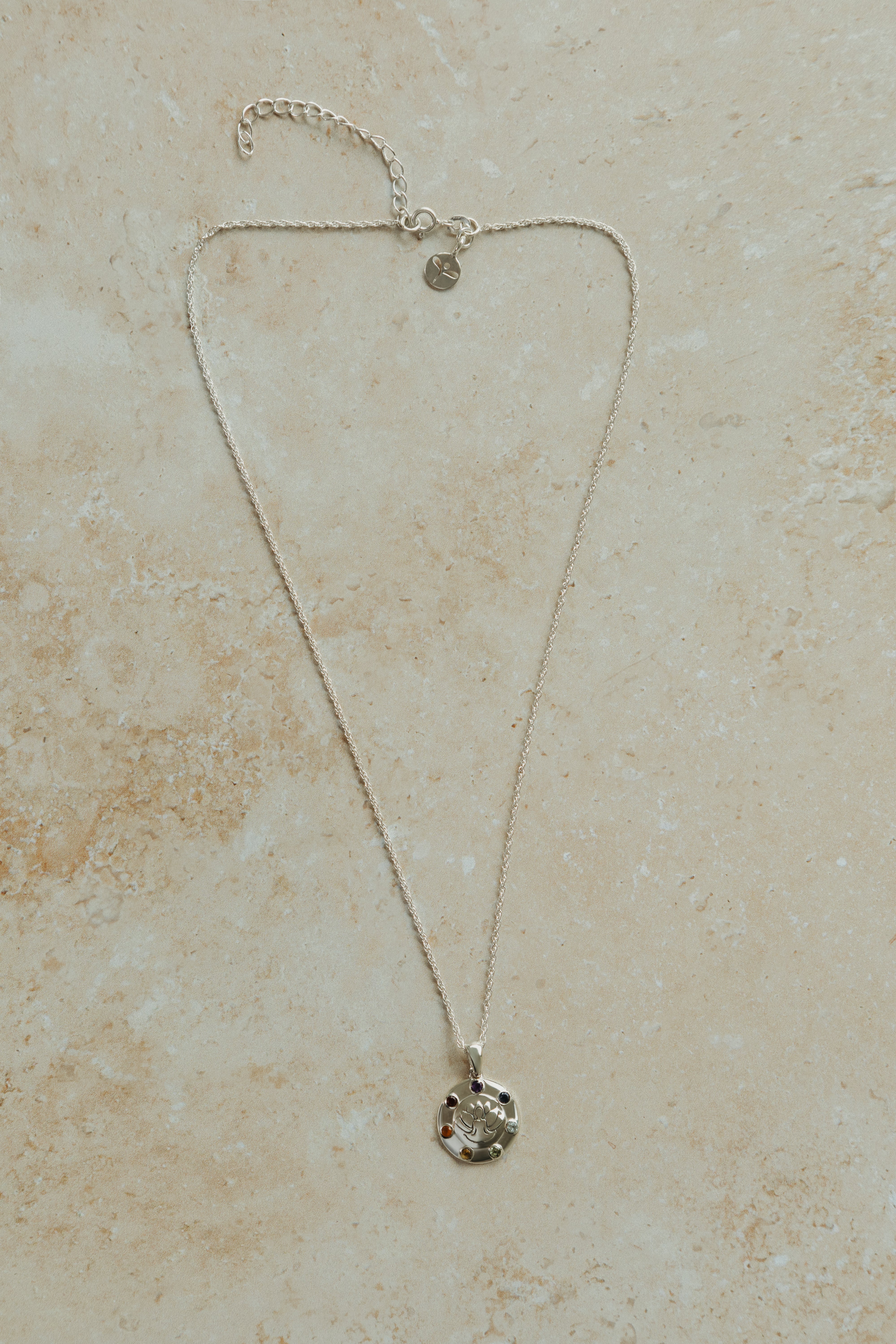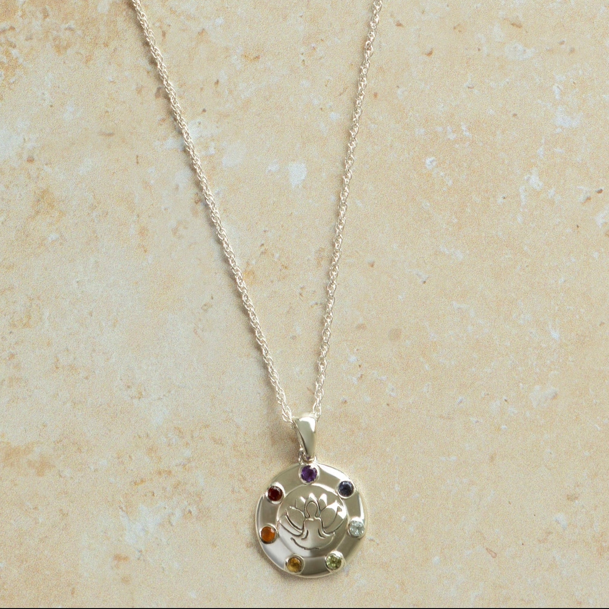 This beautiful design is surrounded by 7 natural semi-precious gemstones that together represent harmonious balance of all the energy centres in the body - Amethyst, Lolite, Blue topaz, Peridot, Citrine, Carnelian & Garnet.