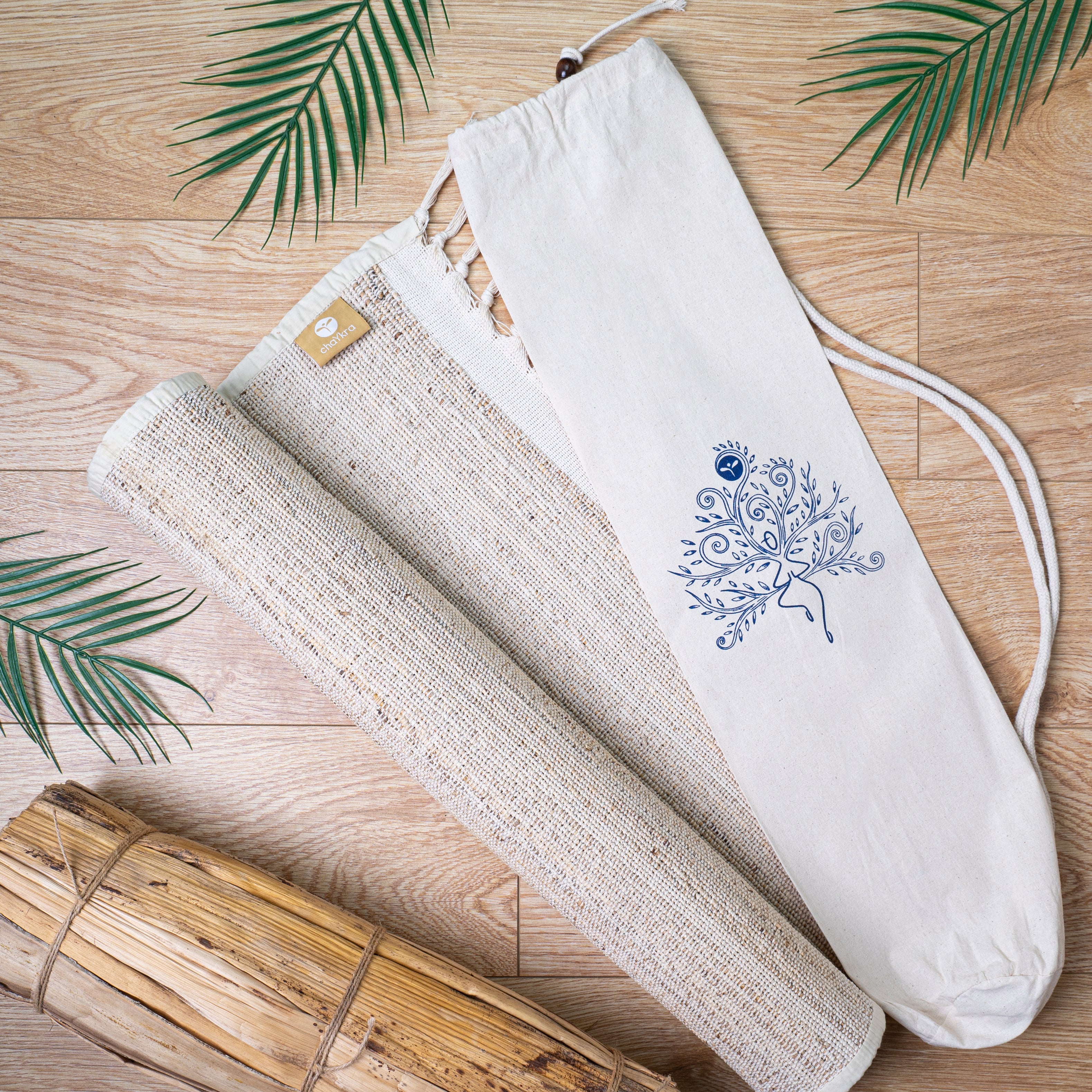 Each banana bark mat purchase comes in a cotton yoga bag printed with an abstract yogi tree of life design.