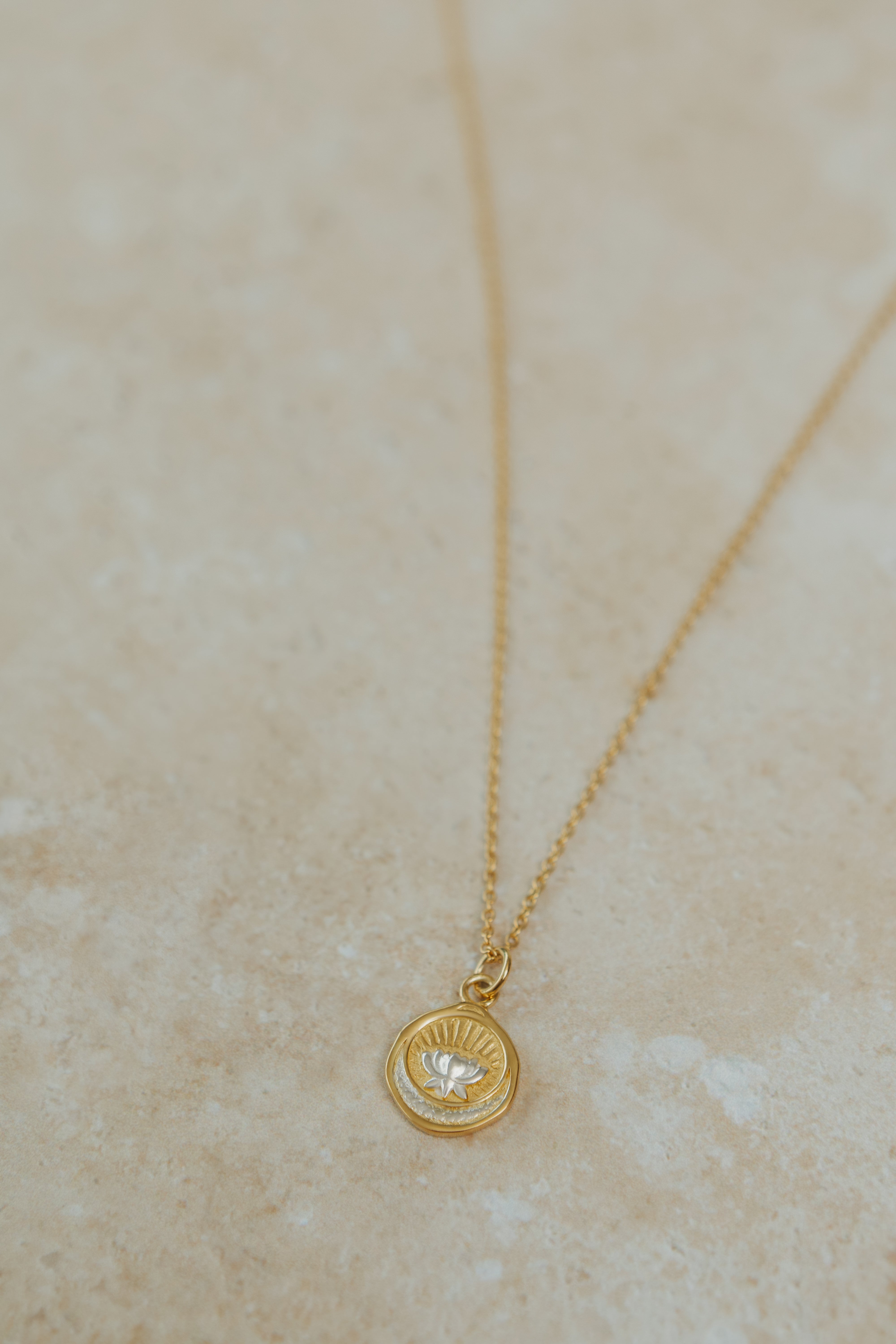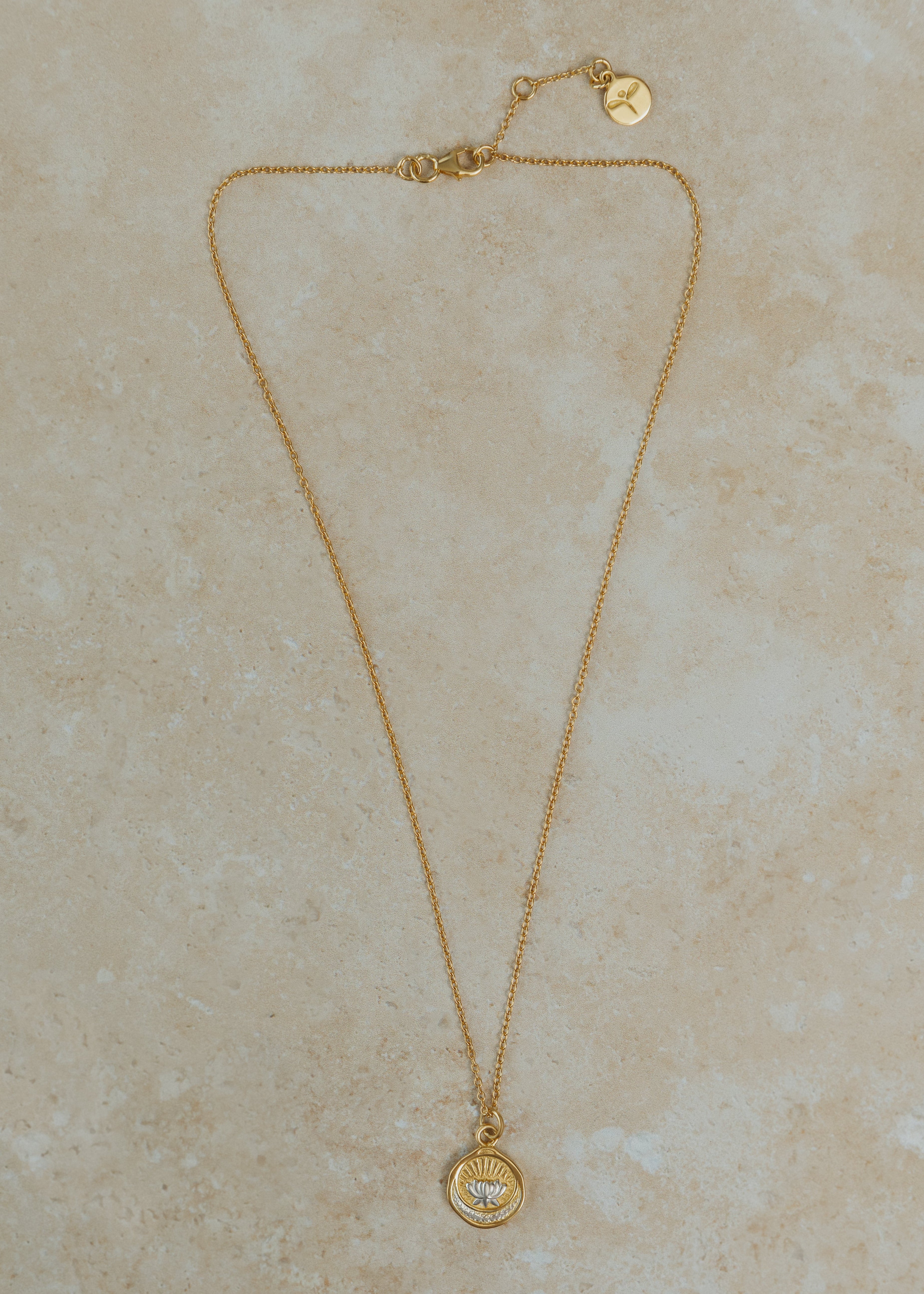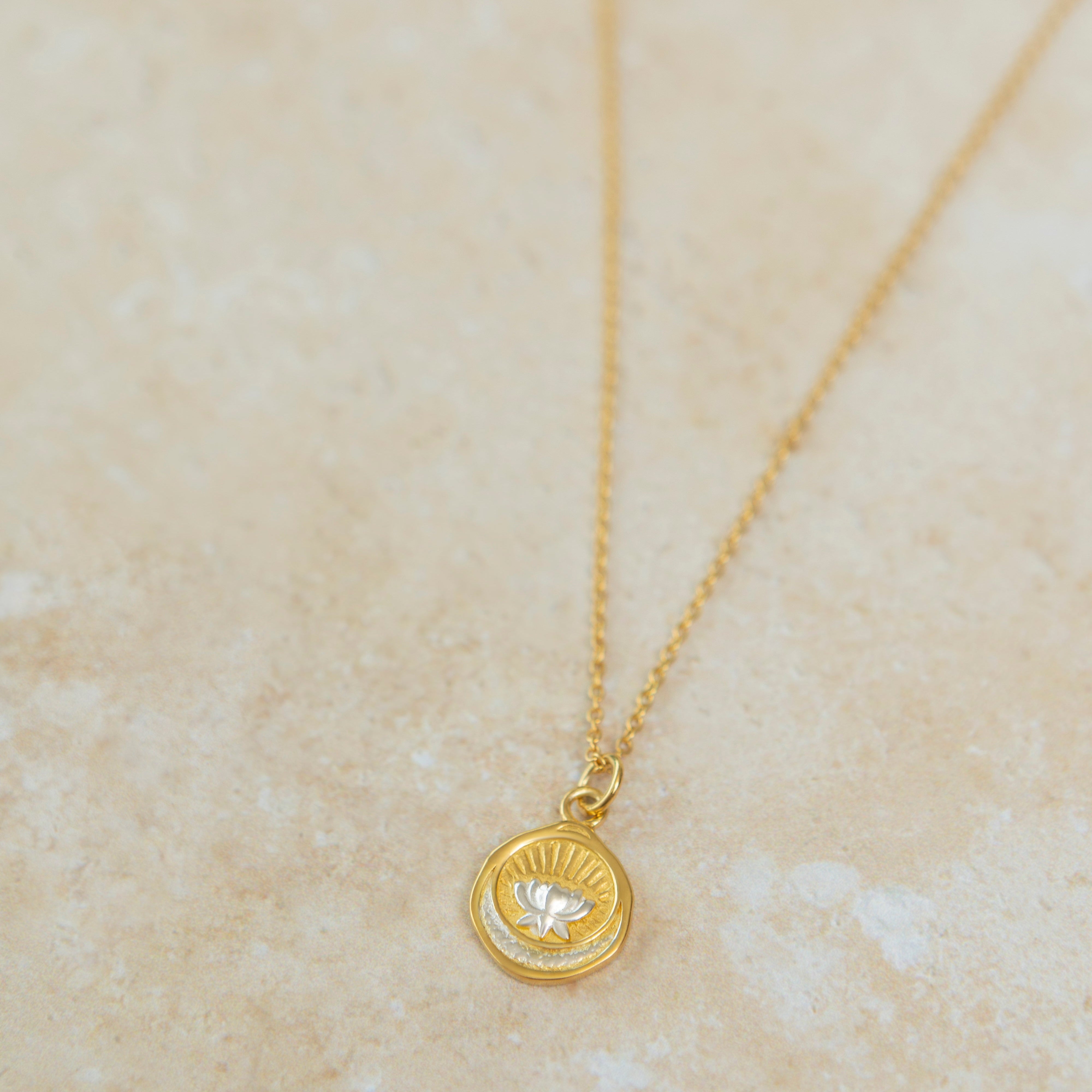 A sculpted lotus blooms at the heart of a golden medallion, framed by luminous sun rays and underpinned by a crescent moon — symbolising renewal, purity, and balance. Crafted in gold & silver tones, this piece evokes effortless elegance and is a beautiful symbol of inner radiance.