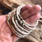 This unique meditation bracelet is made with round white tulsi beads. These are hand crafted from the dried branches of the tulsi plant, revered in Indian tradition as a sacred plant infused with healing powers.
