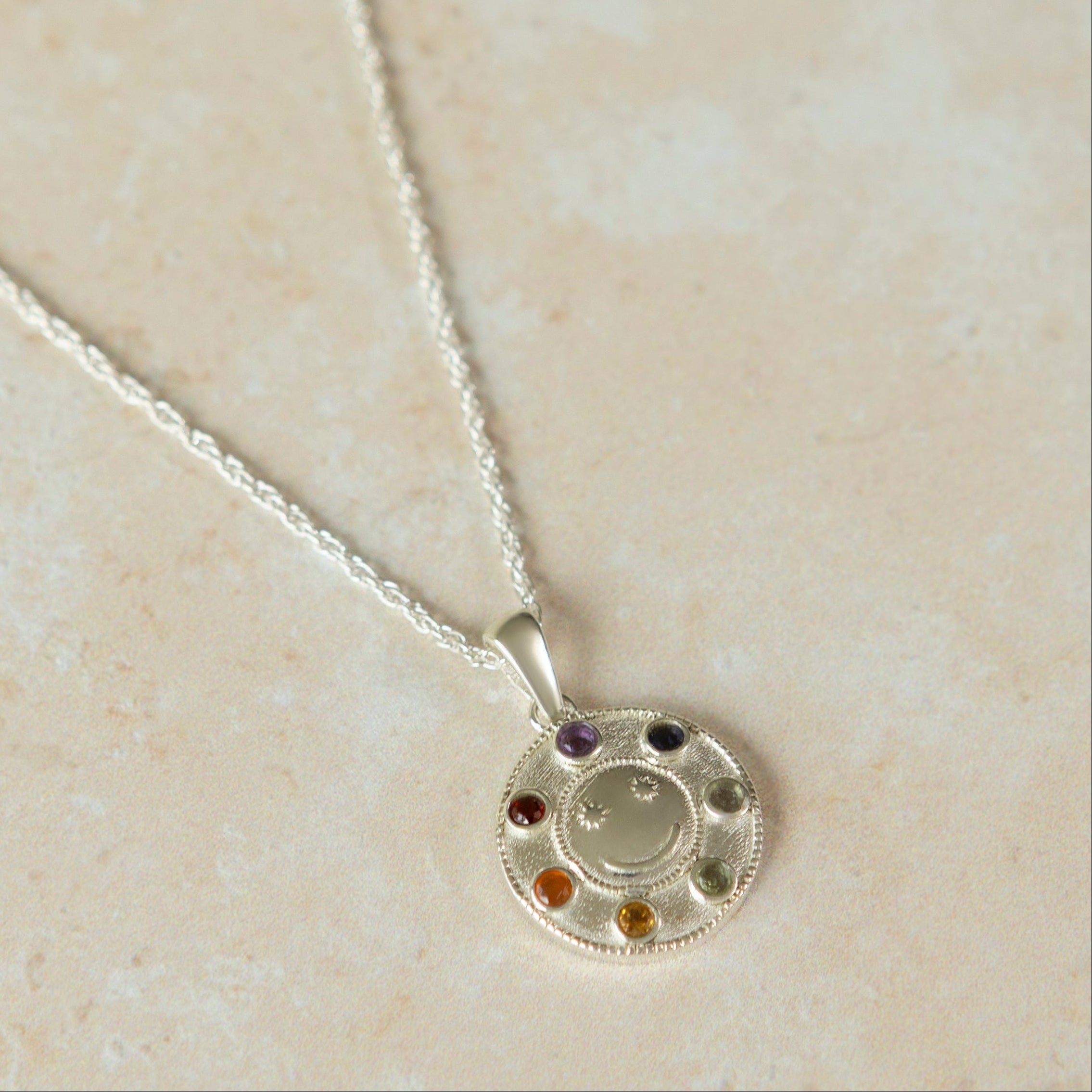 This pendant (925 sterling silver) has been designed in London and beautifully handcrafted in Jaipur, India by artisans. The engraving on this design shows a smiley face, symbolic of the importance of positive energy. By harnessing an optimistic mindset and a ‘cup half full’ attitude you can navigate life in a more enjoyable manner.