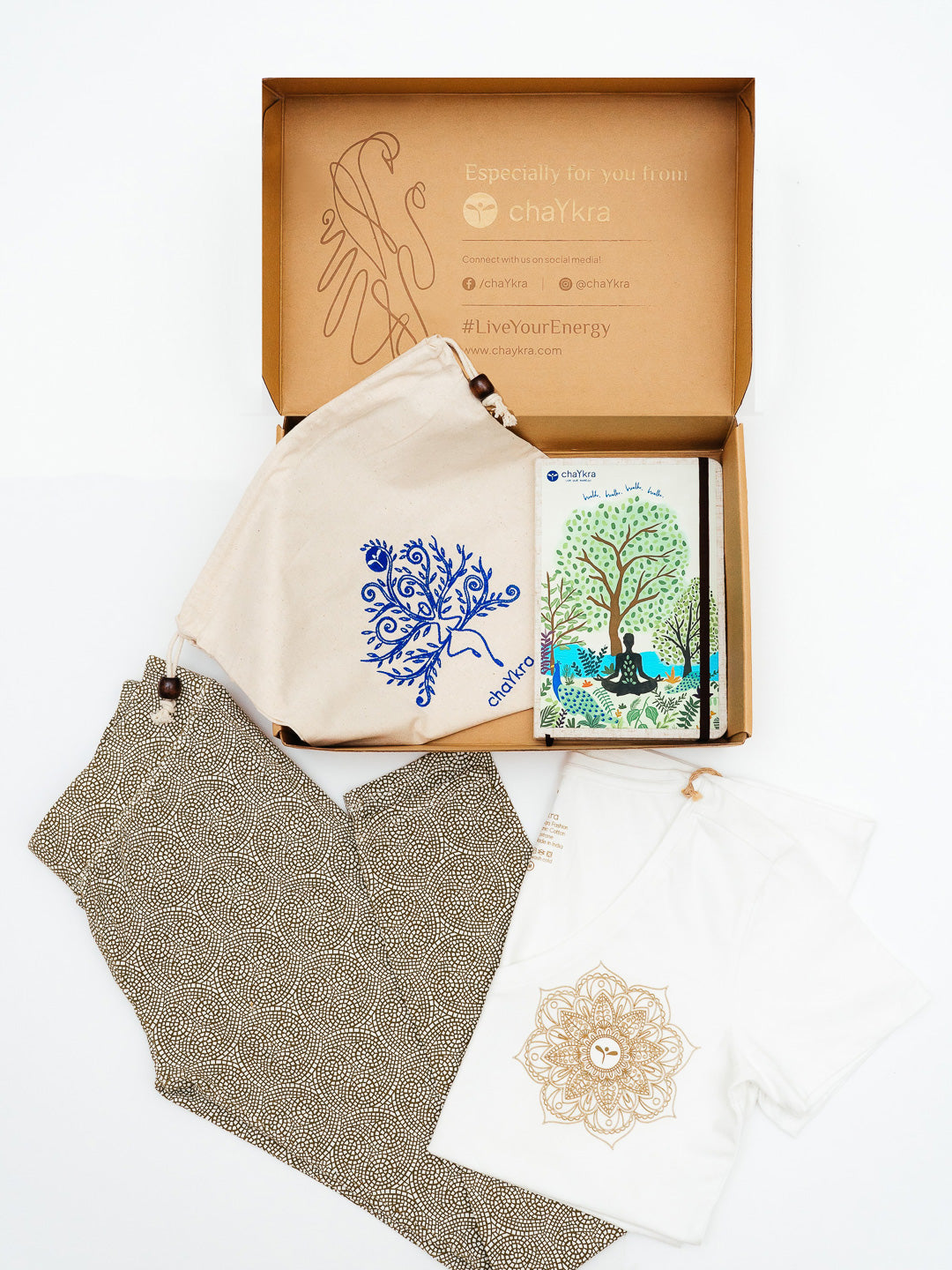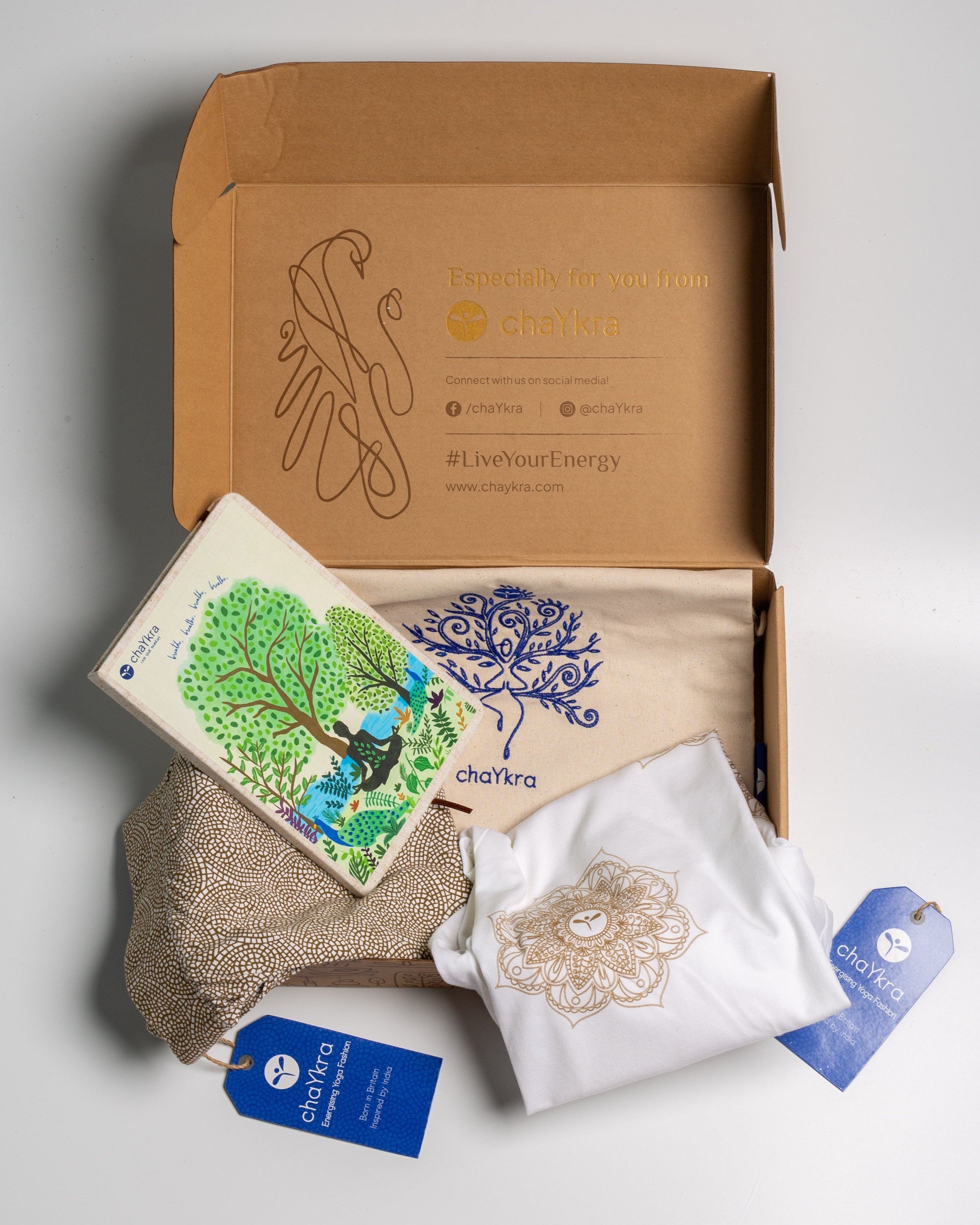 GREAT FOR GIFTING This set is beautifully wrapped in branded tissue paper and a chaYkra branded gift box and includes a chaYkra abstract yogi designed cotton pouch.