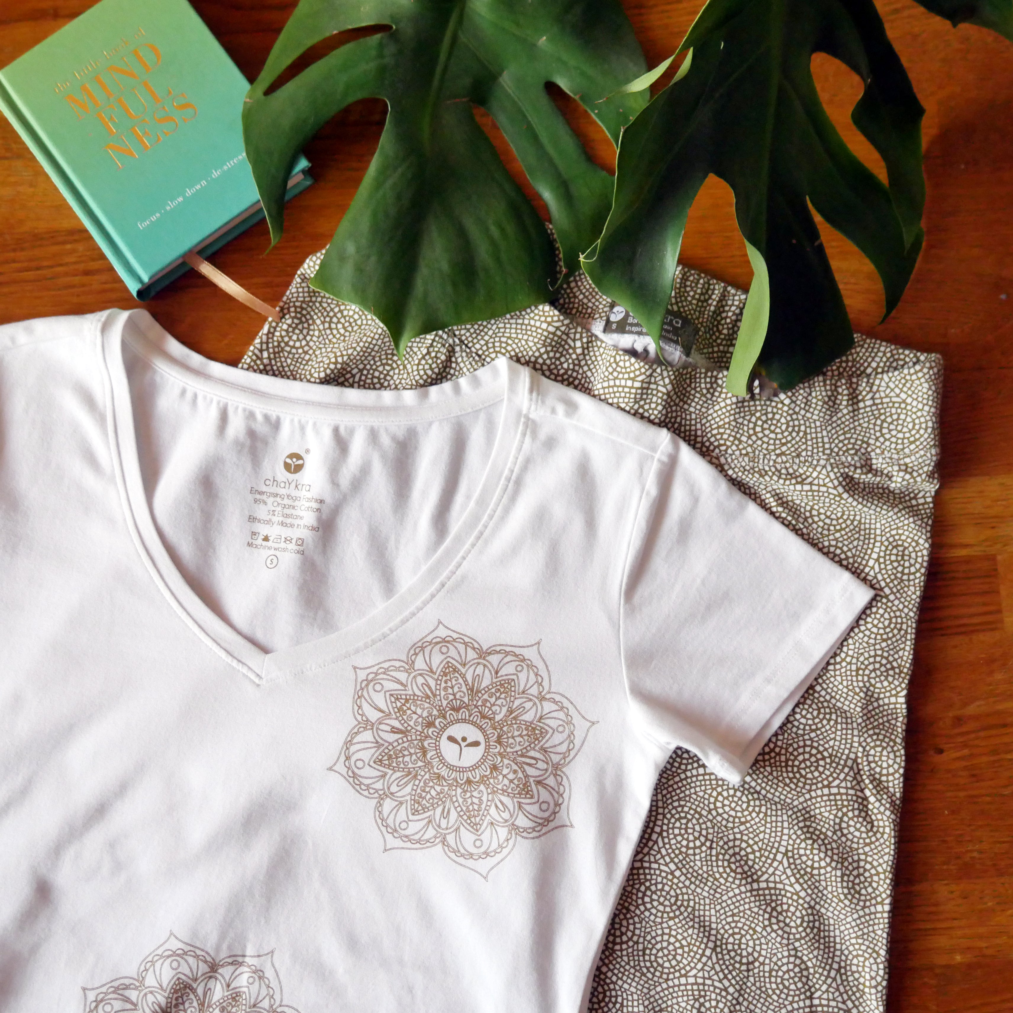 Indian Motif Tee (Gold Flower Design): The gold flowers on this v-neck half sleeve yoga top have been crafted with classic Indian mandala designs in mind. This gold motif symbolises unity, representative of the relationship between mind and body during yoga practice. With a beautiful design and organic stretch cotton for maximum comfort, this top will be a staple in your yoga wardrobe!