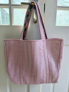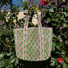 A quilted tote that flips the script. One side displays a fresh green print for a more earthy style, while the reverse showcases soft pink stripes for a classic, feminine aesthetic. Two moods, one bag.