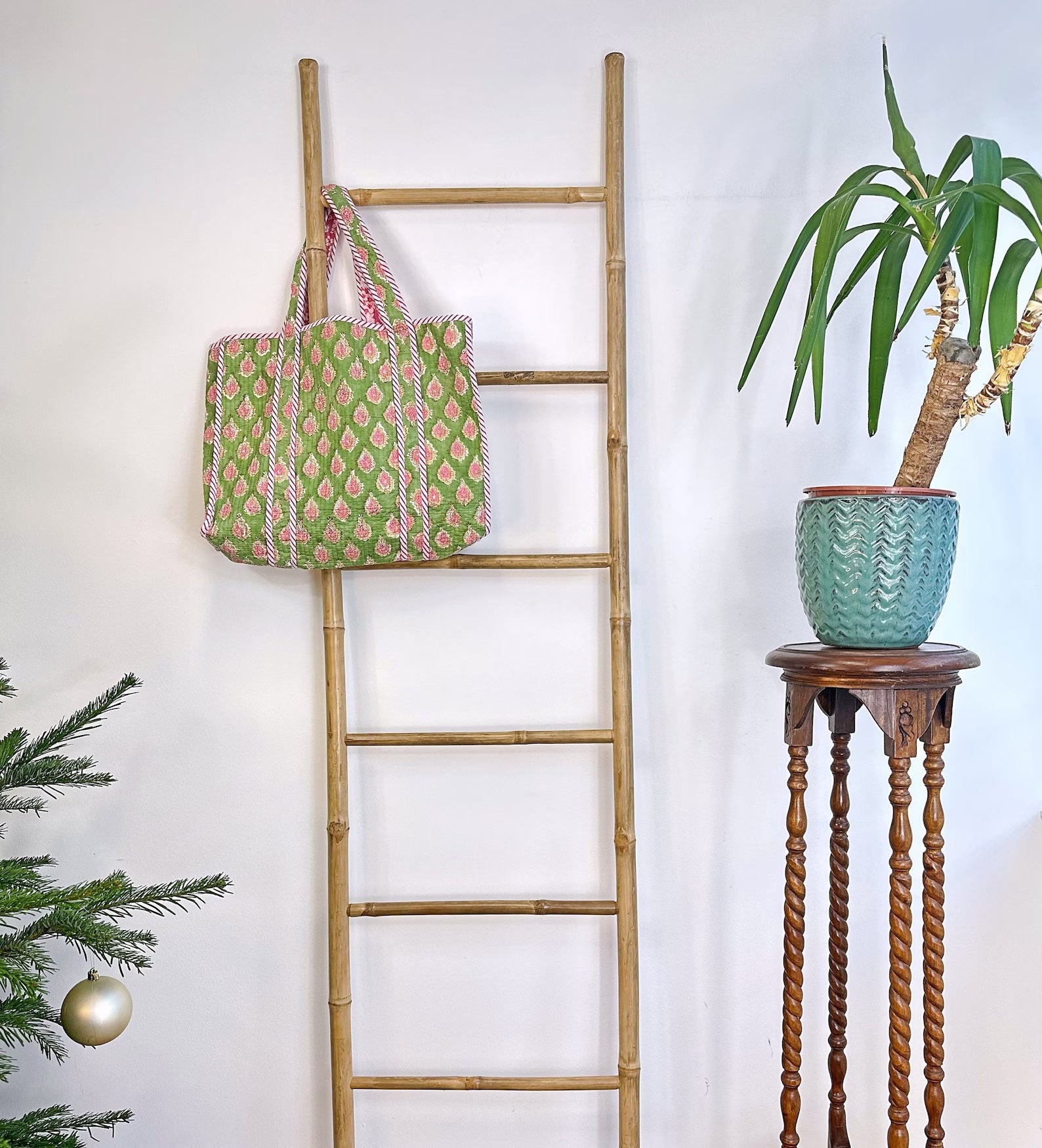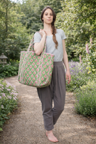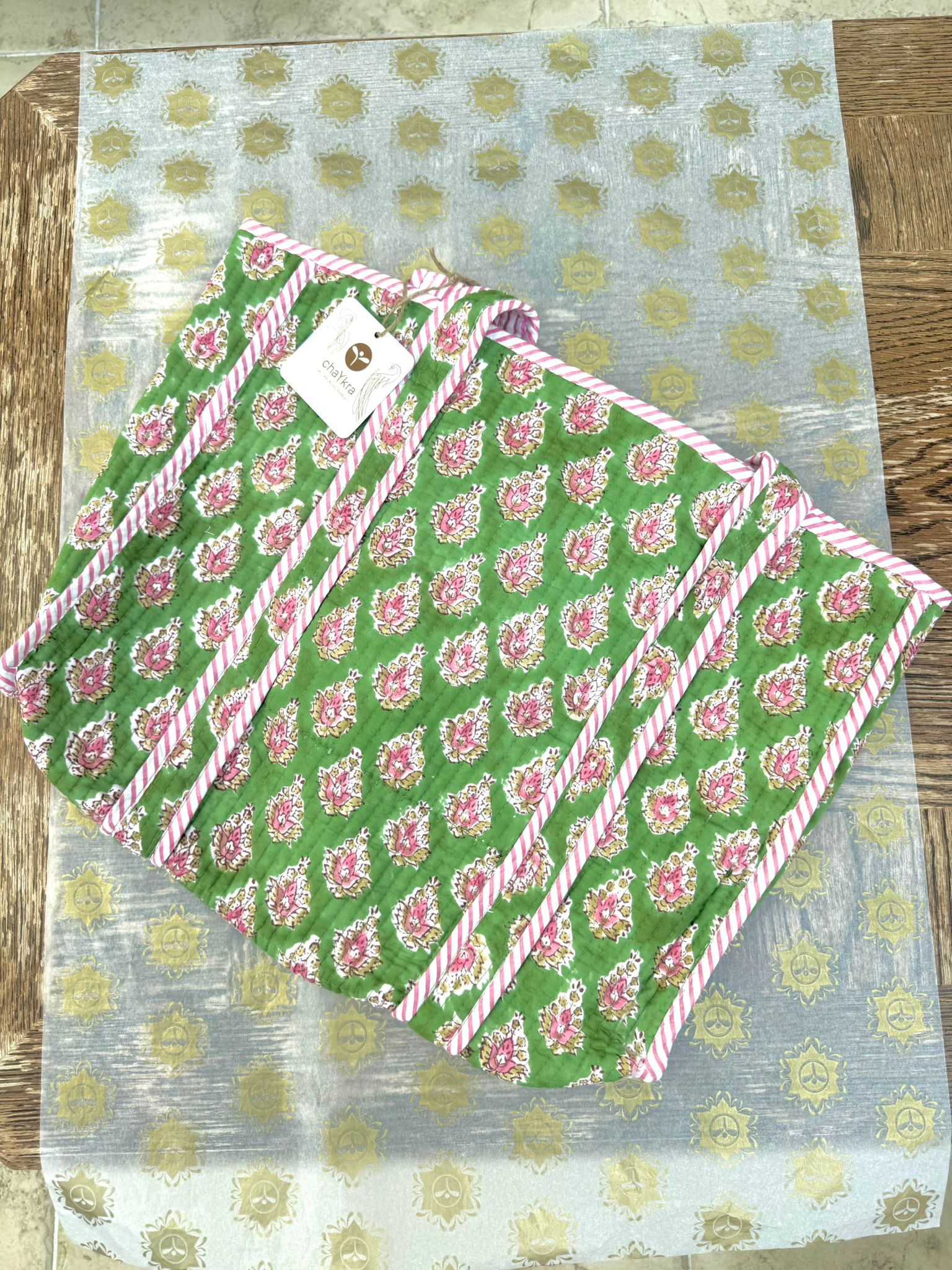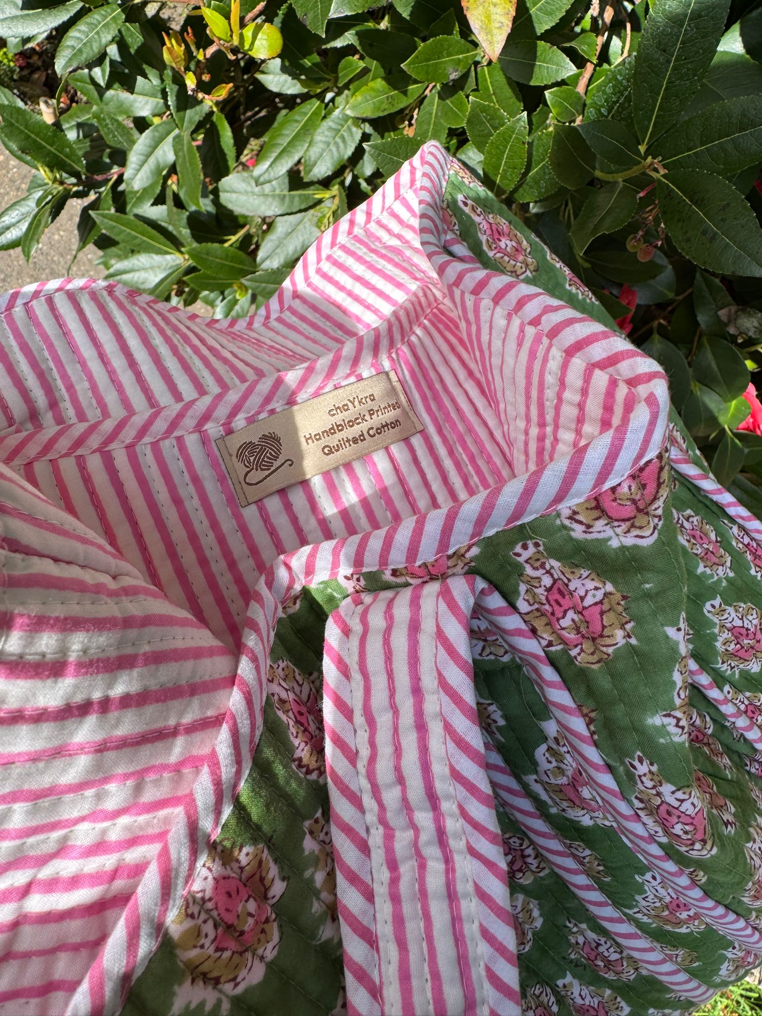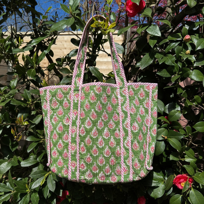 A soft-toned, quilted tote featuring charming hand-block floral prints in fresh greens and playful pinks. Lightweight yet roomy, it’s perfect for everyday errands, beach days, or adding a pop of colour to your outfit. Effortlessly stylish with a touch of artisanal flair.