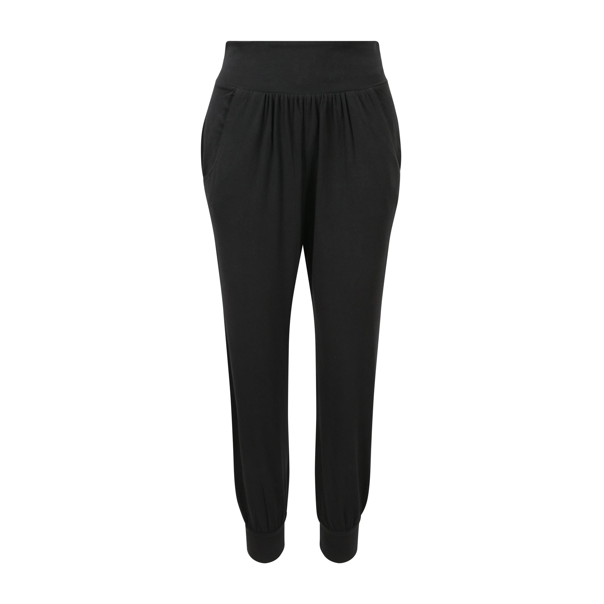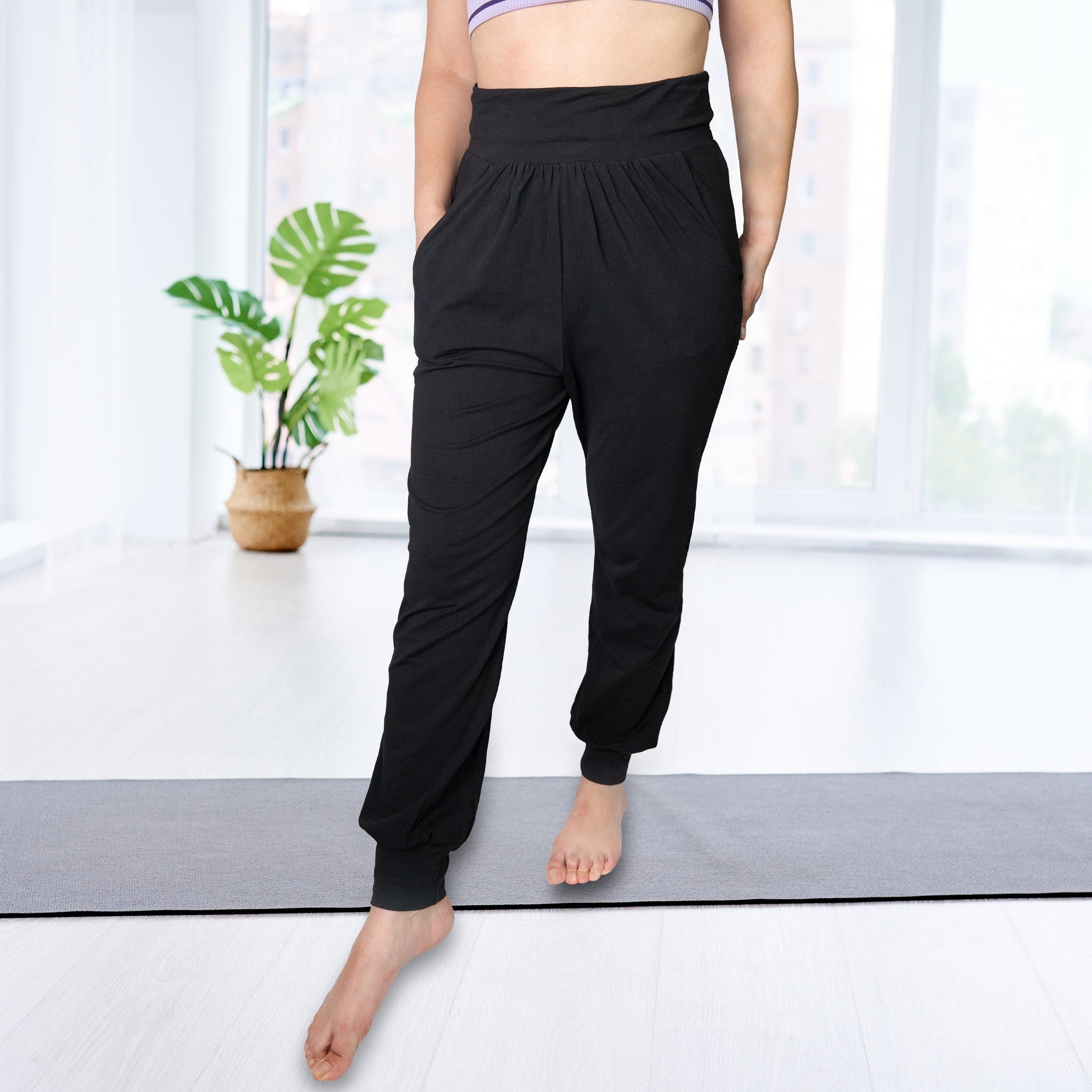 These cute harem pants have a unique design with front pocket details. They are both convenient and stylish, and offer added comfort from a super soft organic cotton fabric blend. The simple design is great for easy matching. These harems are equally perfect for lounging around the house, as well as for your yoga workout.
