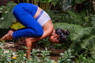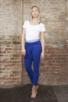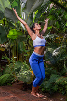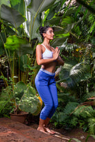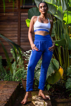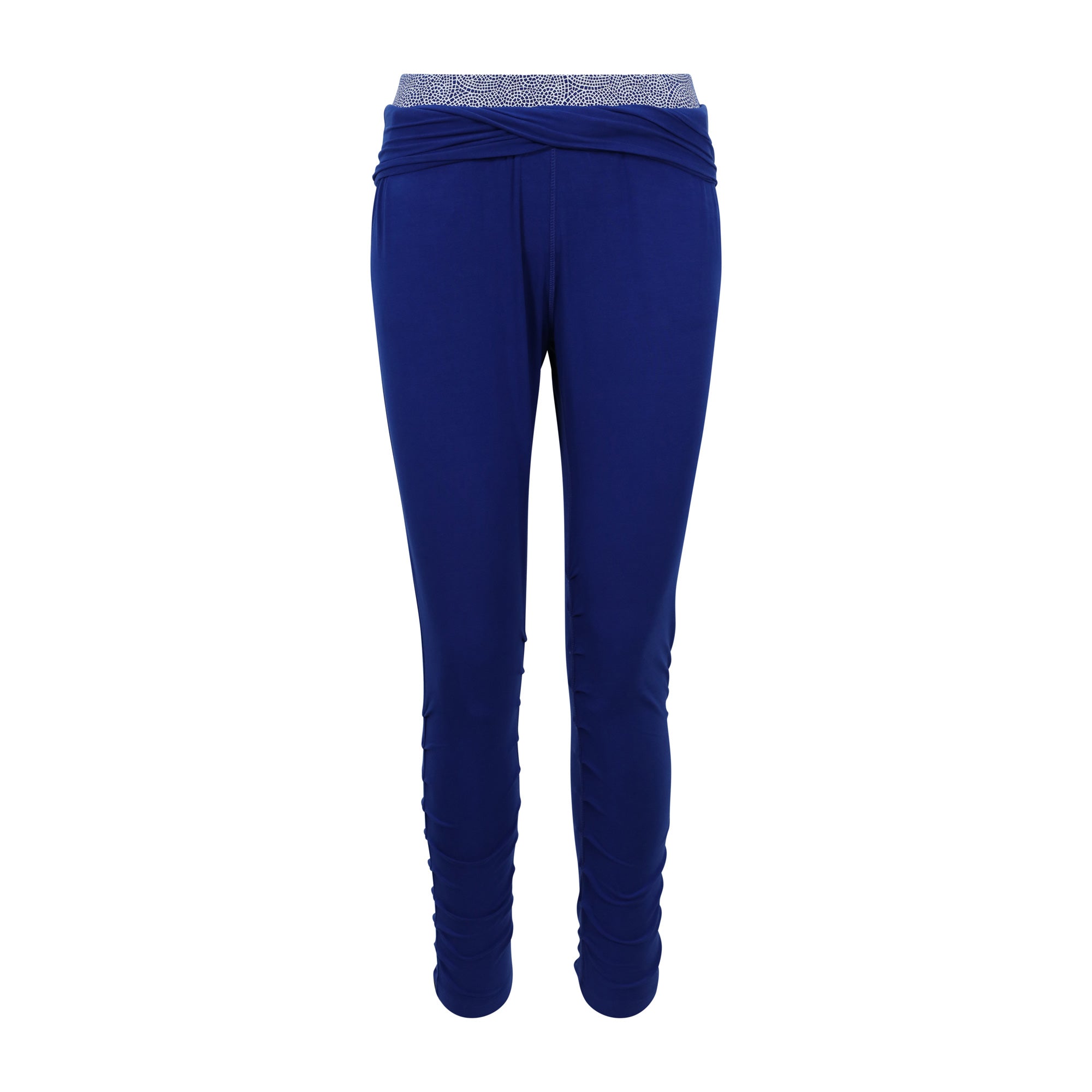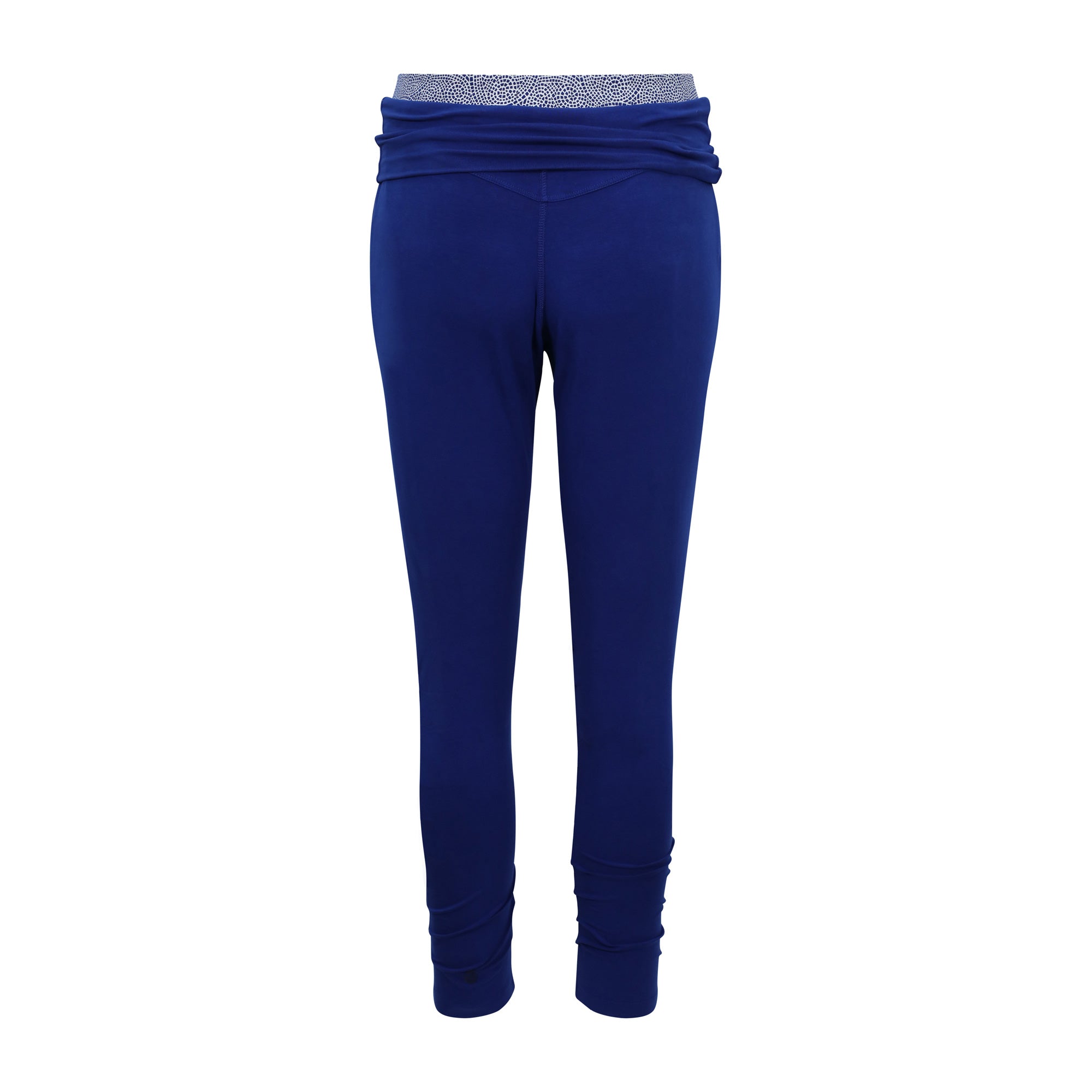 These gorgeous crop pants have a rich navy blue colour and a fold-over detail that reveals a blue & white chakra energy print on the waistband. They also feature front pockets for extra convenience and style. There is a bottom ruching detail that adds another style feature. The unique design of these crop pants is sure to turn heads!