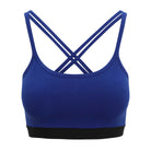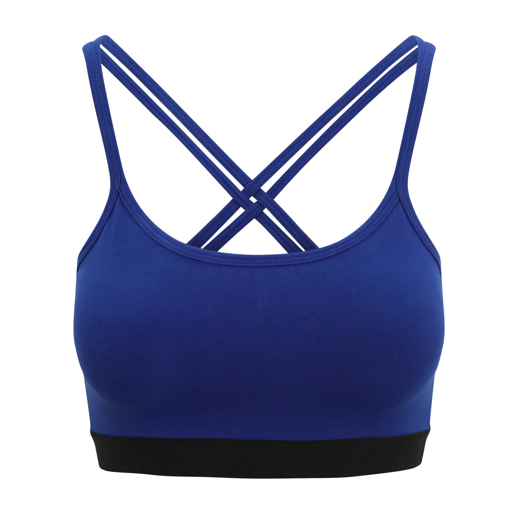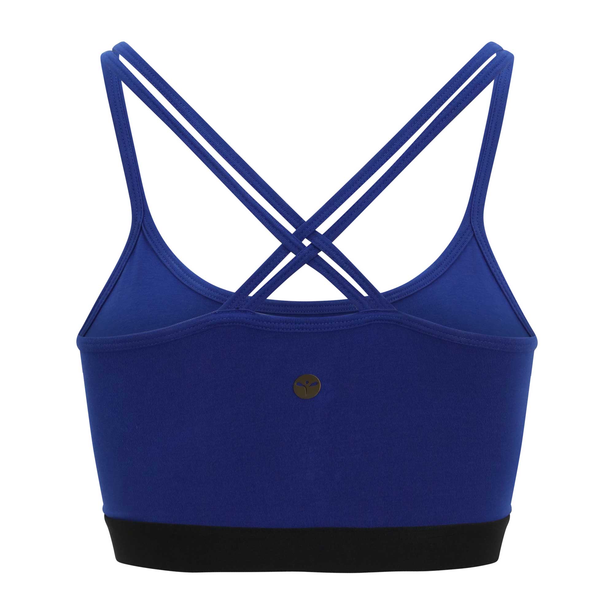 This organic cotton yoga bra delivers on comfort with a super soft finish. Featuring racerback cross over detail, this royal blue bra is a perfect under-garment for many workout tops. The black under-band creates a subtle contrast. This bra provides ideal support for stretching based and low cardio workouts.