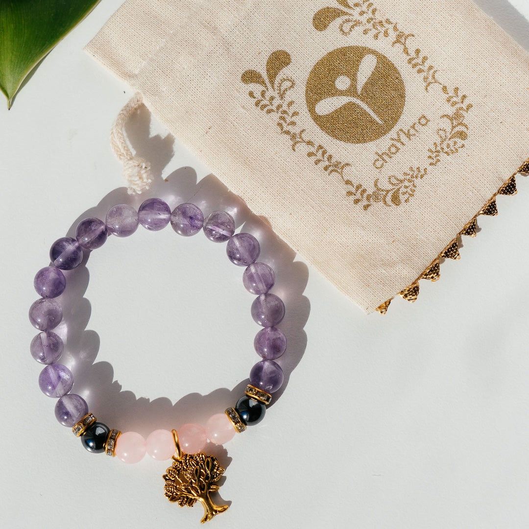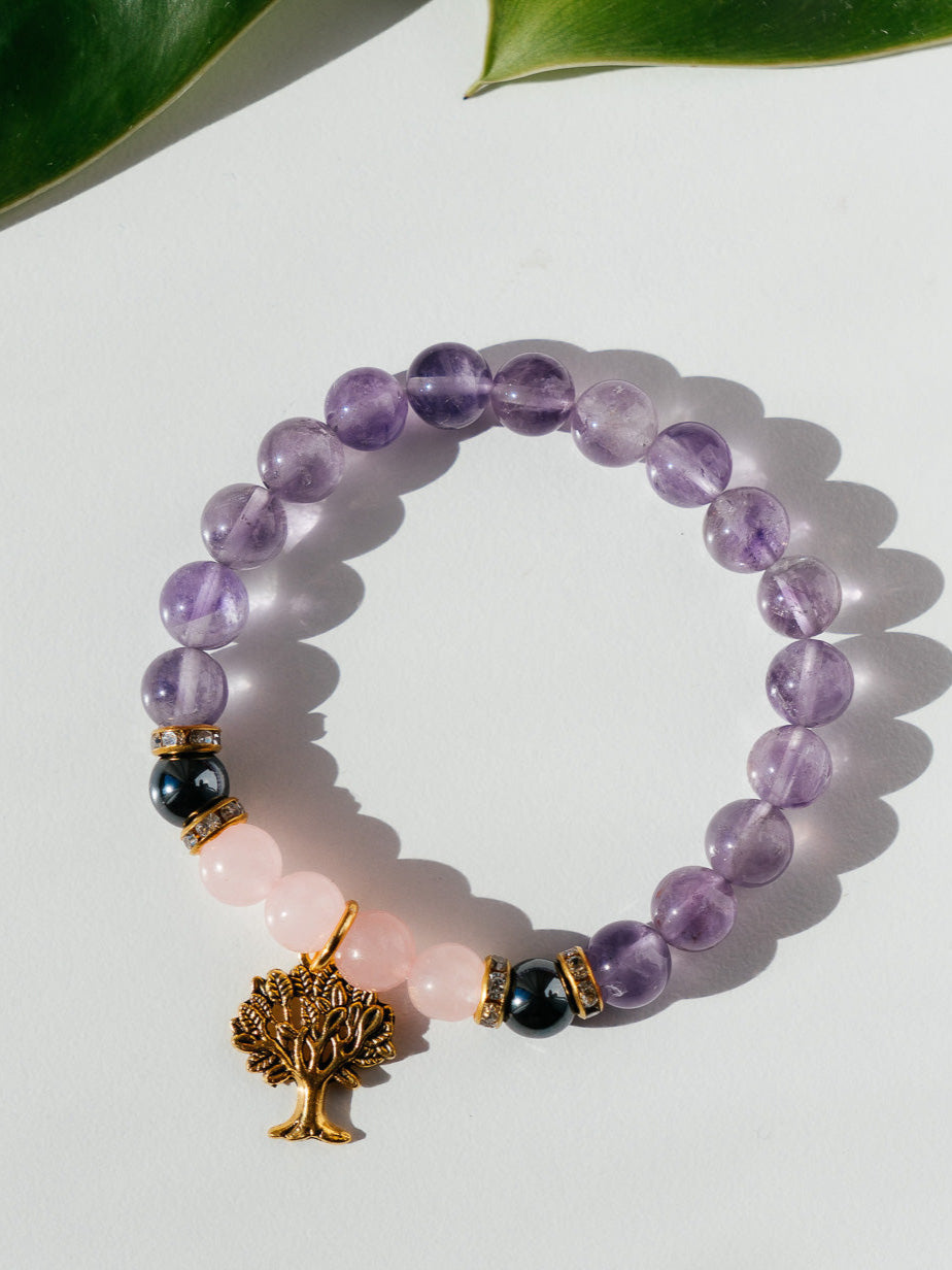 Amethyst Rose Quartz Hematite Bracelet with Tree of Life Charm