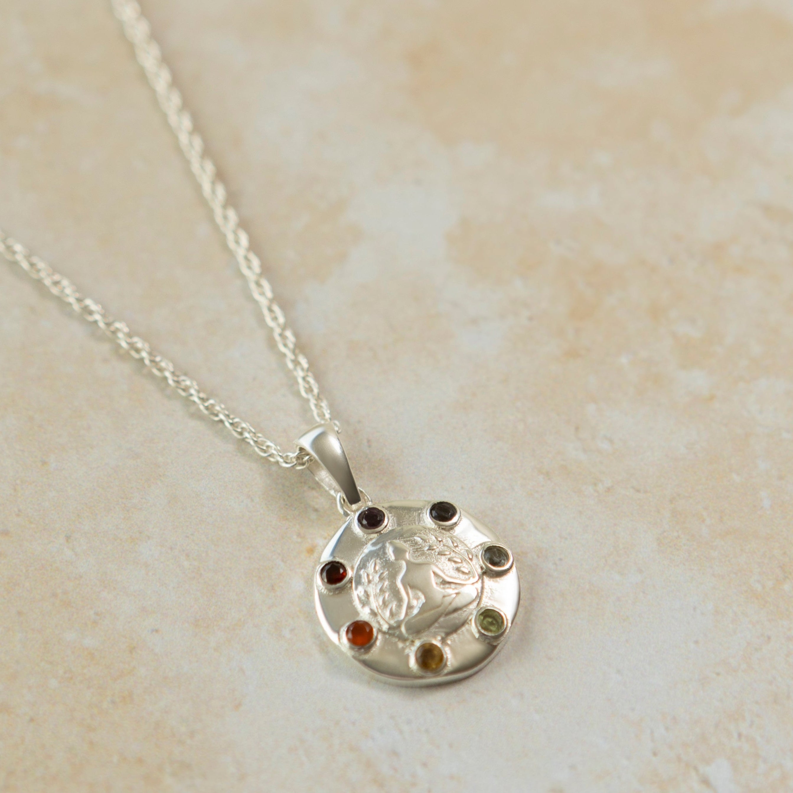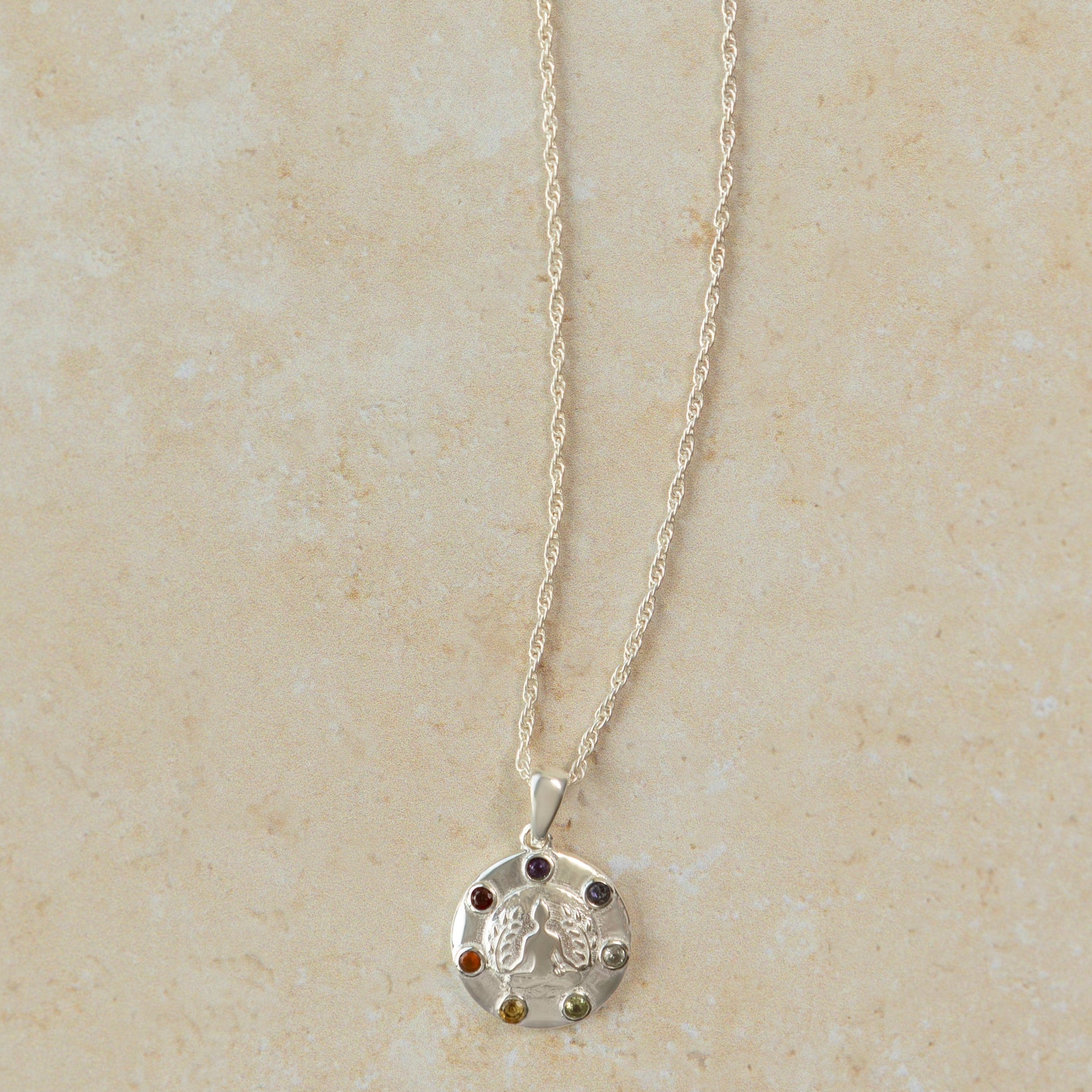 This beautiful design is surrounded by 7 natural semi-precious gemstones that together represent harmonious balance of all the energy centres in the body - Amethyst, Lolite, Blue topaz, Peridot, Citrine, Carnelian & Garnet.